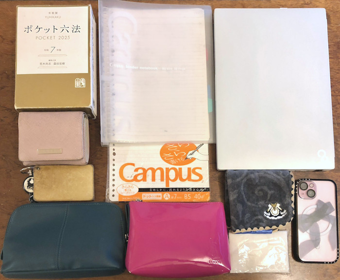 法学科は荷物が多いので、大きめで持ち手が太めのトートバッグやリュックがおすすめです。特に法学科ならではの六法全書に加えて各授業の教科書を入れるとかなりの重さになります!私は荷物が軽い日はトートバッグで、荷物が多い日はリュックや大きめのバッグなど使い分けて過ごしています!