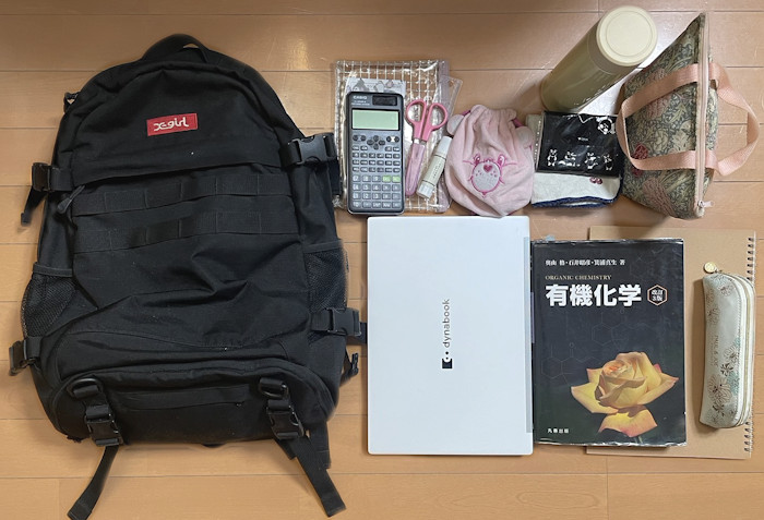 理学部は荷物が多いので、通学カバンはリュックのような両手があき、たくさん荷物が入るものがおすすめです!ただし理学部の子は個人ロッカーがあるので、荷物を置いて帰ることもできます!